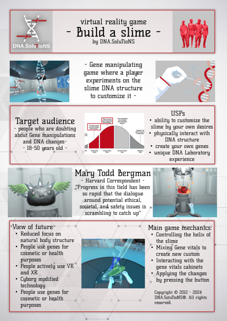 This is a game made by a future gene-therapy company wanting to increase the interest in cosmetic gene modification by making gene therapy more widely understood and accepted. For this purpose they make a fun casual game about gene modification to create a more positive image for the technology and introduce people to the possibilities. In the game you get to create and shape your own amazing pet slime by modifing his DNA.